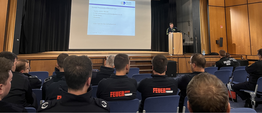 Franz Küpper und Christina Specht, beide von Pressestelle der Kreispolizeibehörde Euskirchen (KPB Euskirchen) erläuterten, wie wichtig abgestimmte Kommunikation zwischen Polizei und Feuerwehr ist – insbesondere an Einsatzstellen. Unter dem Motto „Zwei Partner, ein Ziel“ wurde betont, dass sorgfältige Abstimmung Vorrang vor schnellen Veröffentlichungen hat: „Lieber eine Minute länger abstimmen als ein falscher Post“, so Küpper.
